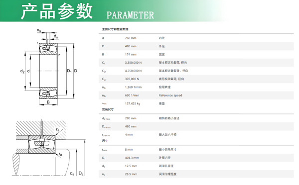 FAG調(diào)心滾子軸承23252-BEA-XL-MB1-C3 1、外圈內(nèi)球面滾道可起自動調(diào)心作用; 2、可承載雙向軸向力和高徑向力,為適應重載荷場合要求而設(shè)計的; 3、E1型為結(jié)構(gòu)增強型,內(nèi)圈上沒有中擋邊,可使?jié)L子更長,承受載荷更大; 4、XL:X-Life軸承具有更好運動學性能和優(yōu)化的滾到表面,并由高性能材料制成且不帶中擋邊。因此,在相同工作條件下,軸承的基本額定動載荷和額定壽命顯著提高。