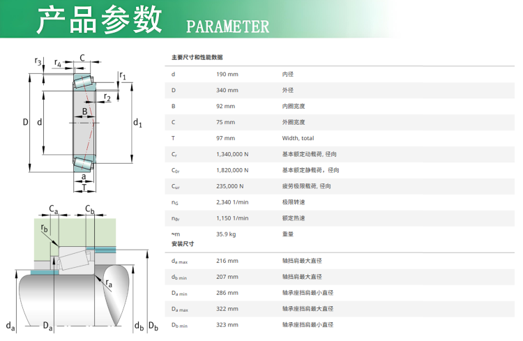 FAG圓錐滾子軸承 產品特征 1、改善了內外圈和滾子的表面質量 2、優化了內圈的擋邊和滾道幾何 3、優化了滾動體幾何 4、品質的內外圈材料 5、改進了熱處理 6、標準化了保持架的設計 FAG圓錐滾子軸承32238A 1、外圈可分離型; 2、滾子與滾道接觸設計是滾動體實現純滾動,減少摩擦和磨損; 3、可承受大的徑向載荷和單向軸向載荷,但是為了可承受雙向軸向載荷,需要兩個一起來配對安裝; 4、后綴A表示內部結構變更;X表示外形尺寸采用國際標準;B表示加大的接觸角; 應用設備部位:重齒減速機VBP1800高速軸