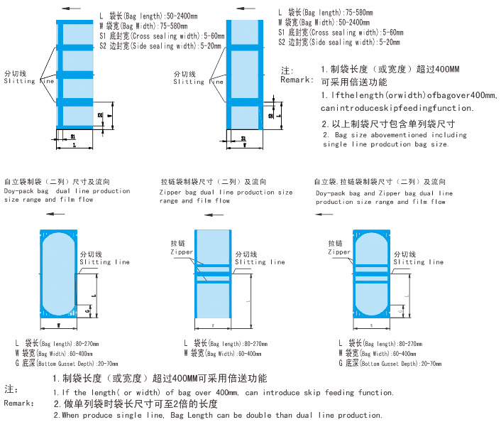 產品用途: 該機適用于以BOPP、OPP、CPP、PE、尼龍、鋁箔、紙張為基材的兩層或多層三邊封復合薄膜袋(食品袋、洗衣粉袋、糖果袋等)的生產,有上拉鍵和生產自立袋功能,本設備操作簡便,產品平整,形狀美觀,封邊處熱合強度高,制袋速度快是理想的包裝制袋設備。產品特點: 1、整機采用進口PLC,人機界面集中控制。性能穩定,易于操作、維護。操作界面中、英文可互相切換。2、放料交流變頻電機自動送料,速度與主機同步,恒張力控制。 3、主料放卷為水平式氣脹輥放卷,氣動鎖定。K形折料架,LPC自動糾偏。 4、輔料放卷為水平式氣脹軸放卷,三角板折料,恒張力控制。 5、送料牽引為進口三伺服電機驅動,張力浮輥控制,動態補償。 6、上、下封壓采用進口伺服電機驅動,燙壓時間可按制袋燙壓要求設定,氣缸提拉式倍送功能。 7、二排橋式鏈封,五排橋式邊封,五組底封及其循環水冷卻結構。 8、燙壓刀溫度采用PID調節,0~300℃可調,無觸點自動控制,人機界面集中設定。 9、多功能氣動沖孔裝置,廢邊料切除自動收取,靜電消除裝置。 10、沖孔方式:可設置連續,間隔,停止,沖孔時間可預置。 11、計數方式:數量、批數自動累計,具有預置功能。 12、批送功能:工作臺具備批送功能,批送數量可預置。 13、工作方式:定長制袋,光電跟蹤制袋,點料自動尋標功能。 14、倍送方式:一至六倍送。 15、伺服電機過載保護,放卷無料自動停機。 穿膜圖: