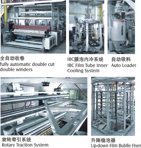 該機組為滿足客戶對高質、高產吹膜設備的要求,采用了帶有強制進料功能的擠出機、精密型陶瓷加熱器、精密型雙風口風環、水平式旋轉牽引系統、IBC內冷系統、全自動雙剖雙收表面摩擦收卷機、計算機集中控制系統等先進技術和裝備。與同類設備相比,具有結構更緊湊、產量更高、制品質量更好、機器更節能、操作更簡便等優點。可以廣泛用于種類高透明性包裝薄膜的生產,為您創造可觀的經濟效益。