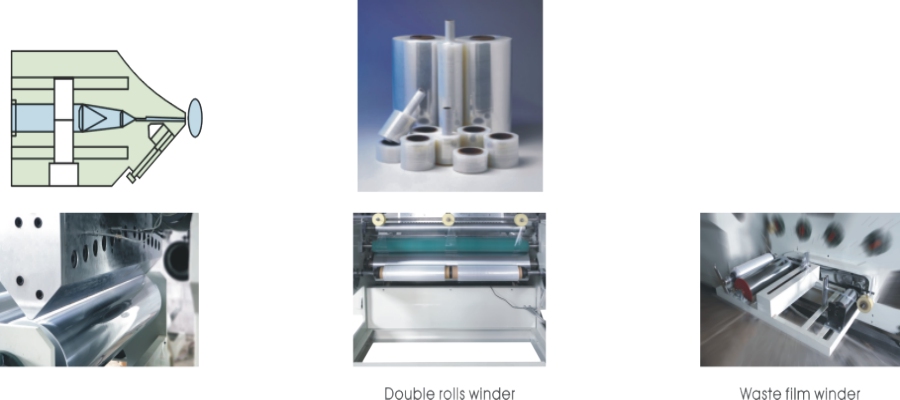 共擠纏繞膜機(jī)組以LLDPE(線型低密度聚乙烯)為主要原料,采用幾種不同牌號(hào)的樹(shù)脂,通過(guò)擠出機(jī) 擠出而生產(chǎn)出具有自粘性的單面粘或雙面粘拉伸纏繞膜,該膜具有較高的拉伸強(qiáng)度、抗穿 刺能力及耐沖擊性。纏繞膜具有良好的回縮記憶及自粘性,能使貨物緊裹成一個(gè)整體,防 止運(yùn)輸時(shí)閃落倒塌及灰塵污染,并且該膜還具有優(yōu)良的透明度和延伸性,能使包裝物品美 觀大方,經(jīng)濟(jì)實(shí)用。可廣泛用于大宗貨物的集裝化托盤(pán)包裝,是運(yùn)輸中用熱收縮包裝膜較 好的替代產(chǎn)品。